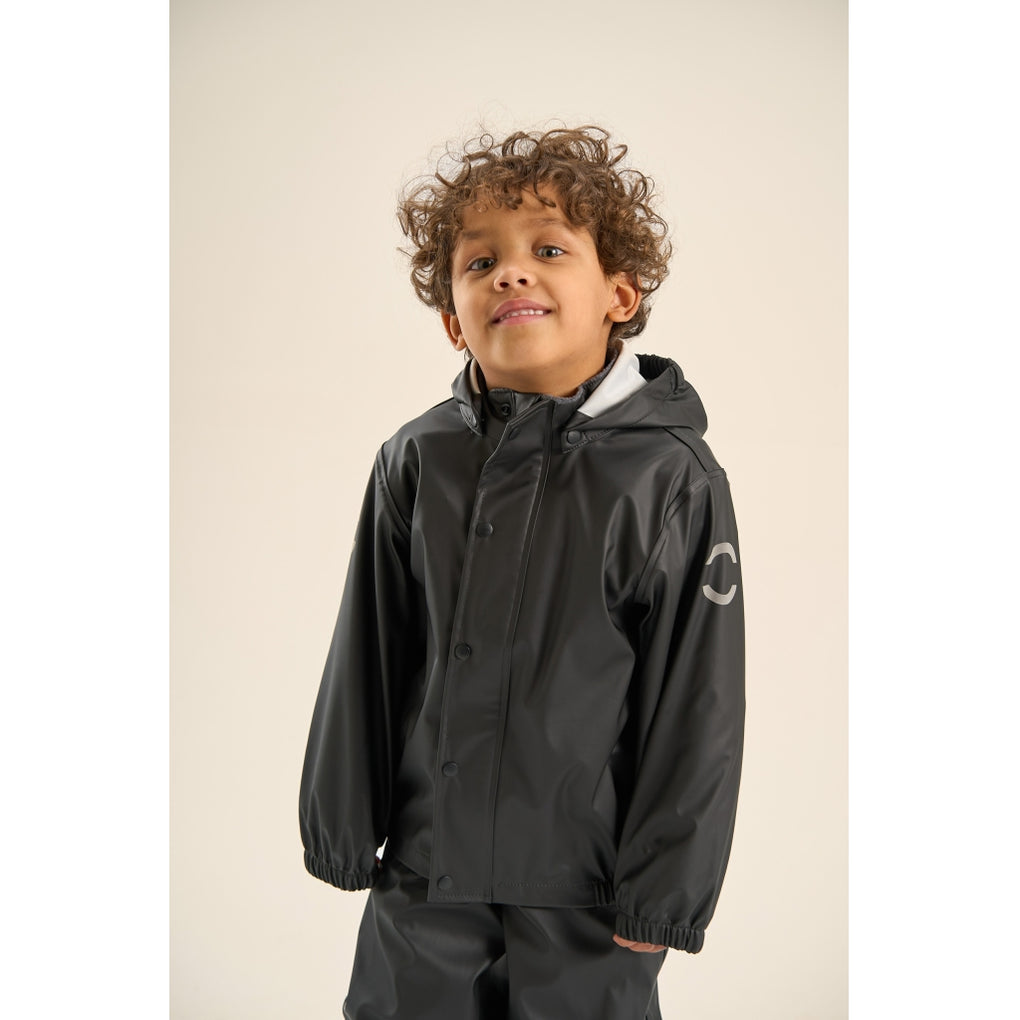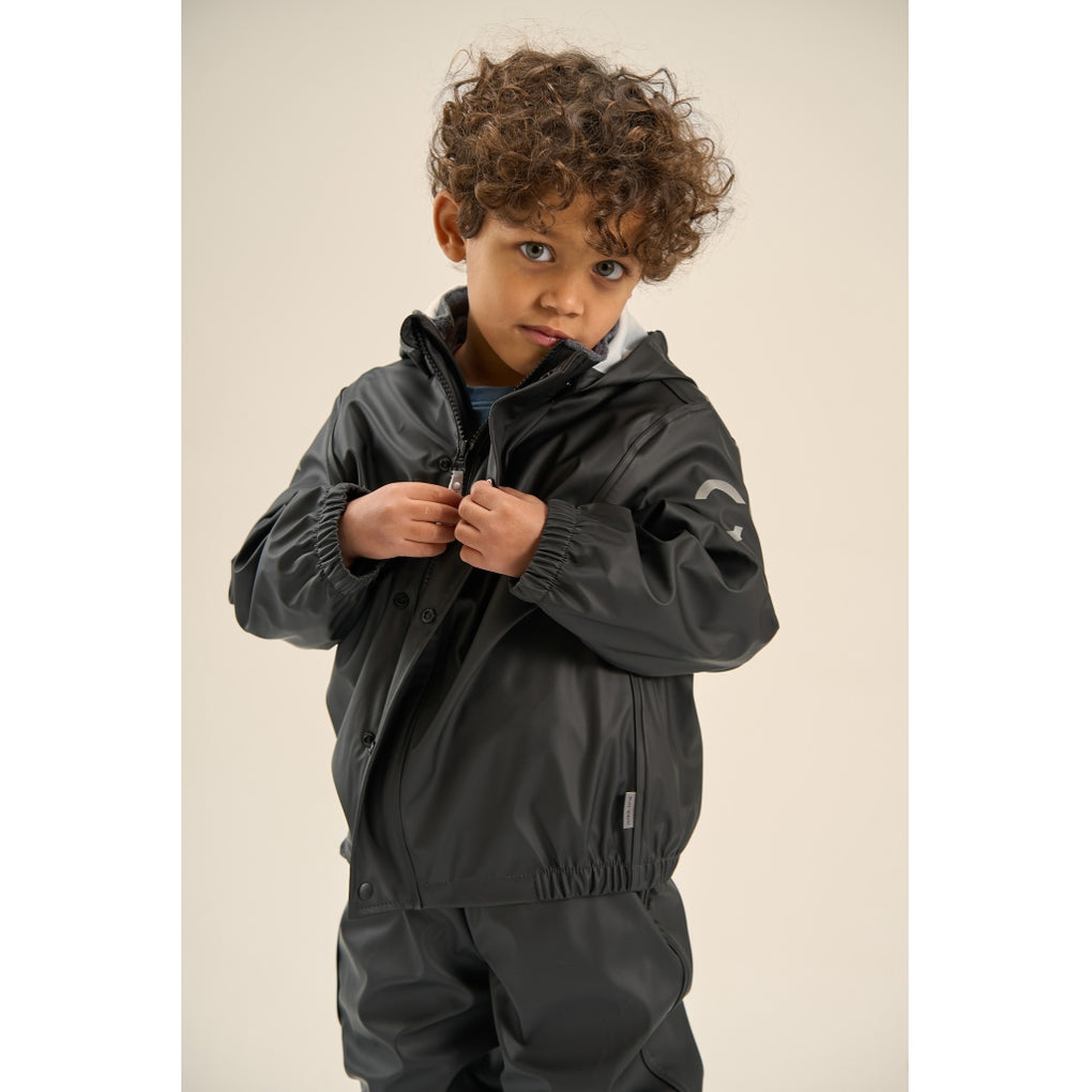 Mikk-line’s classic PU rainwear set without suspenders. This rainwear set is made of waterproof fabric, and it is designed for children to have fun in the rain, jumping puddles, sliding down the wet slide, playing in the wet sandbox etc. Place the adjustable foot straps underneath the wellies/boots to prevent the pants from sliding up and keep the feet dry. The set also features a name tag with room for more than one name, so please pass it on and let it be re-loved.