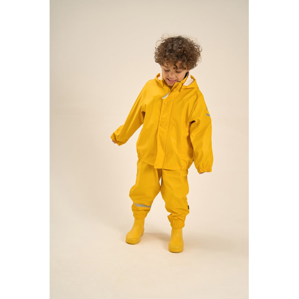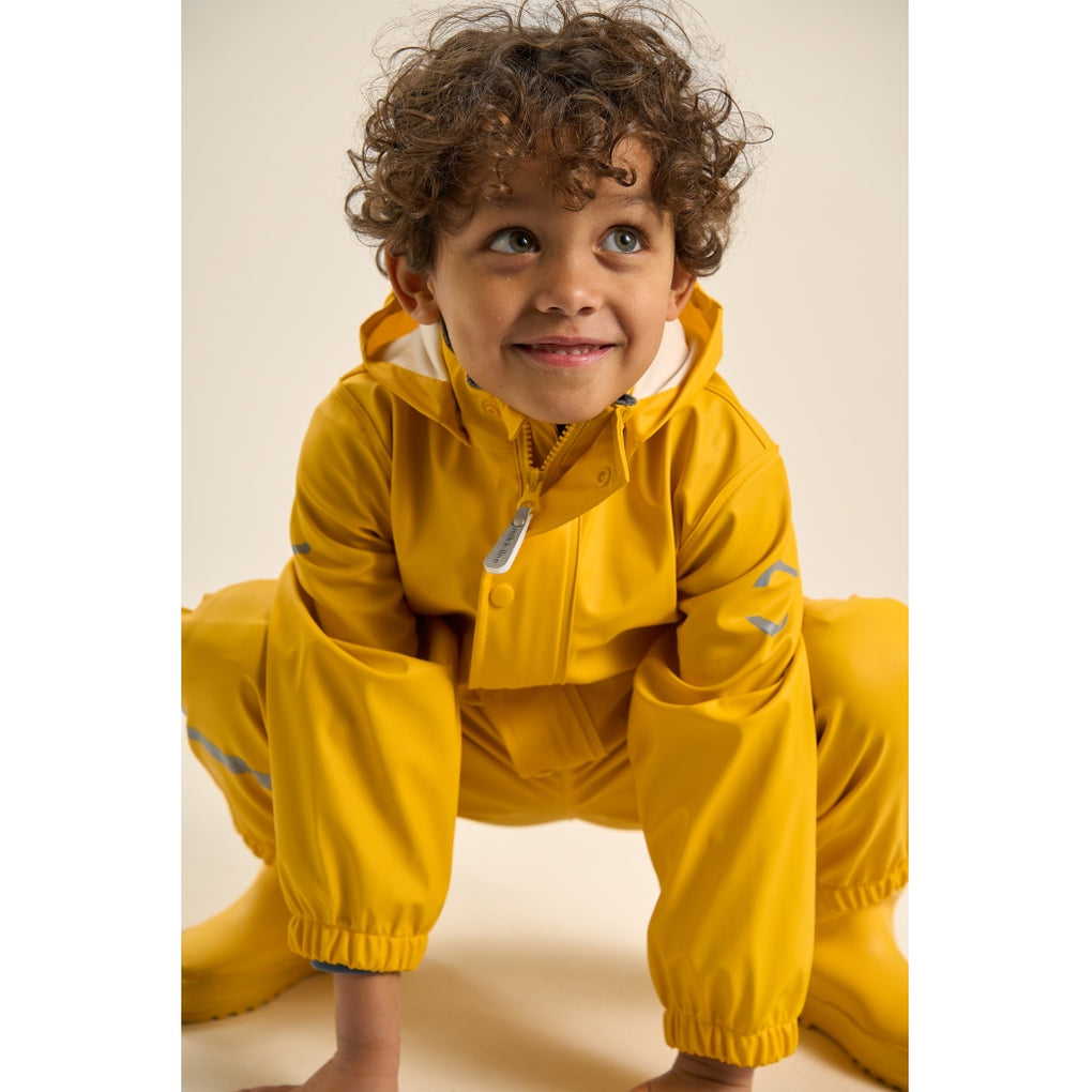 Mikk-line’s classic PU rainwear set with suspenders. This rainwear set is made of waterproof fabric, and it is designed for children to have fun in the rain, jumping puddles, sliding down the wet slide, playing in the wet sandbox etc. Place the adjustable foot straps underneath the wellies/boots to prevent the pants from sliding up and keep the feet dry. The set also features a name tag with room for more than one name, so please pass it on and let it be re-loved.