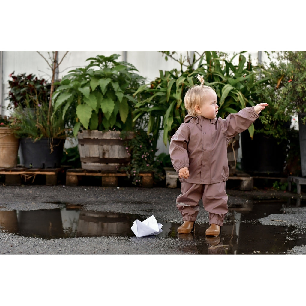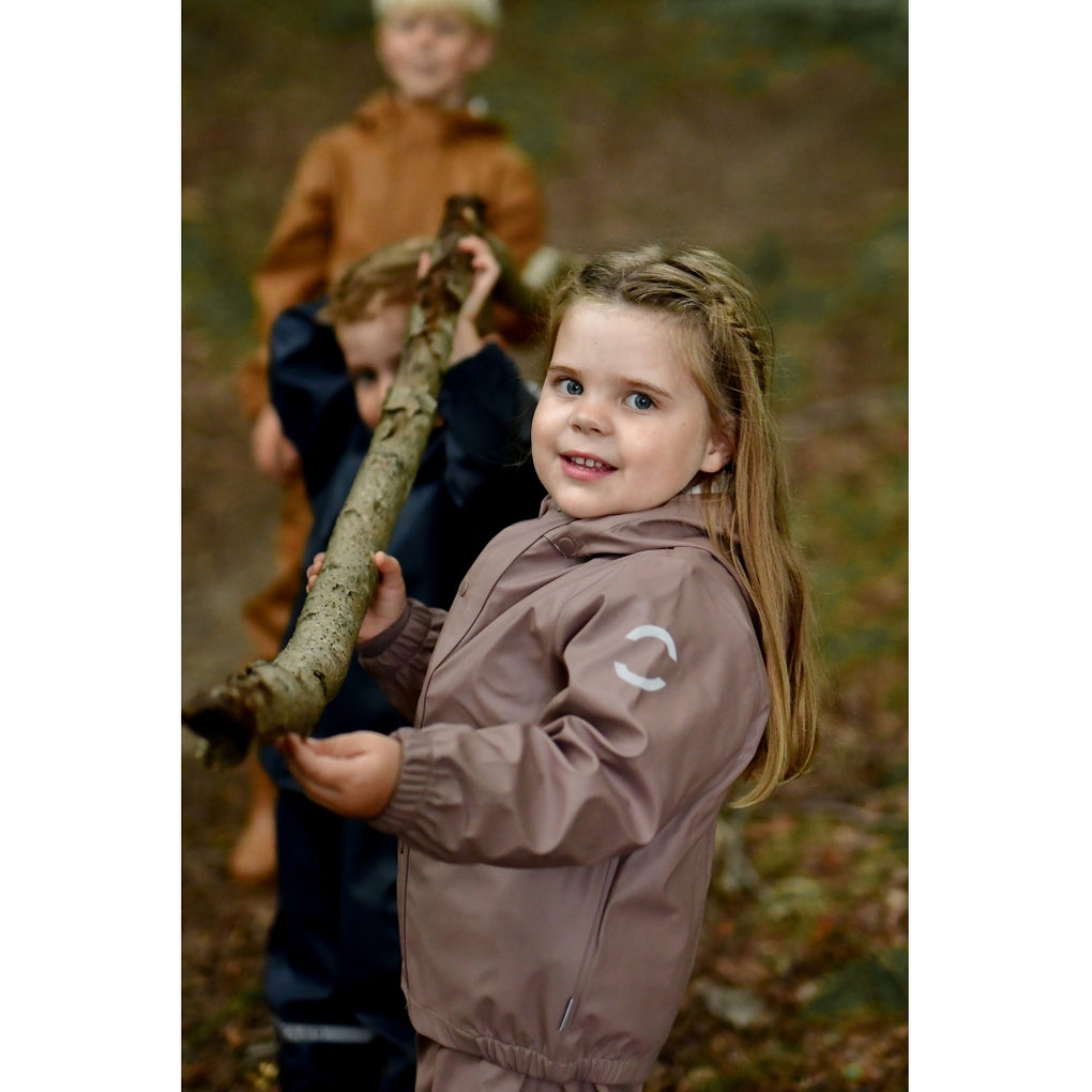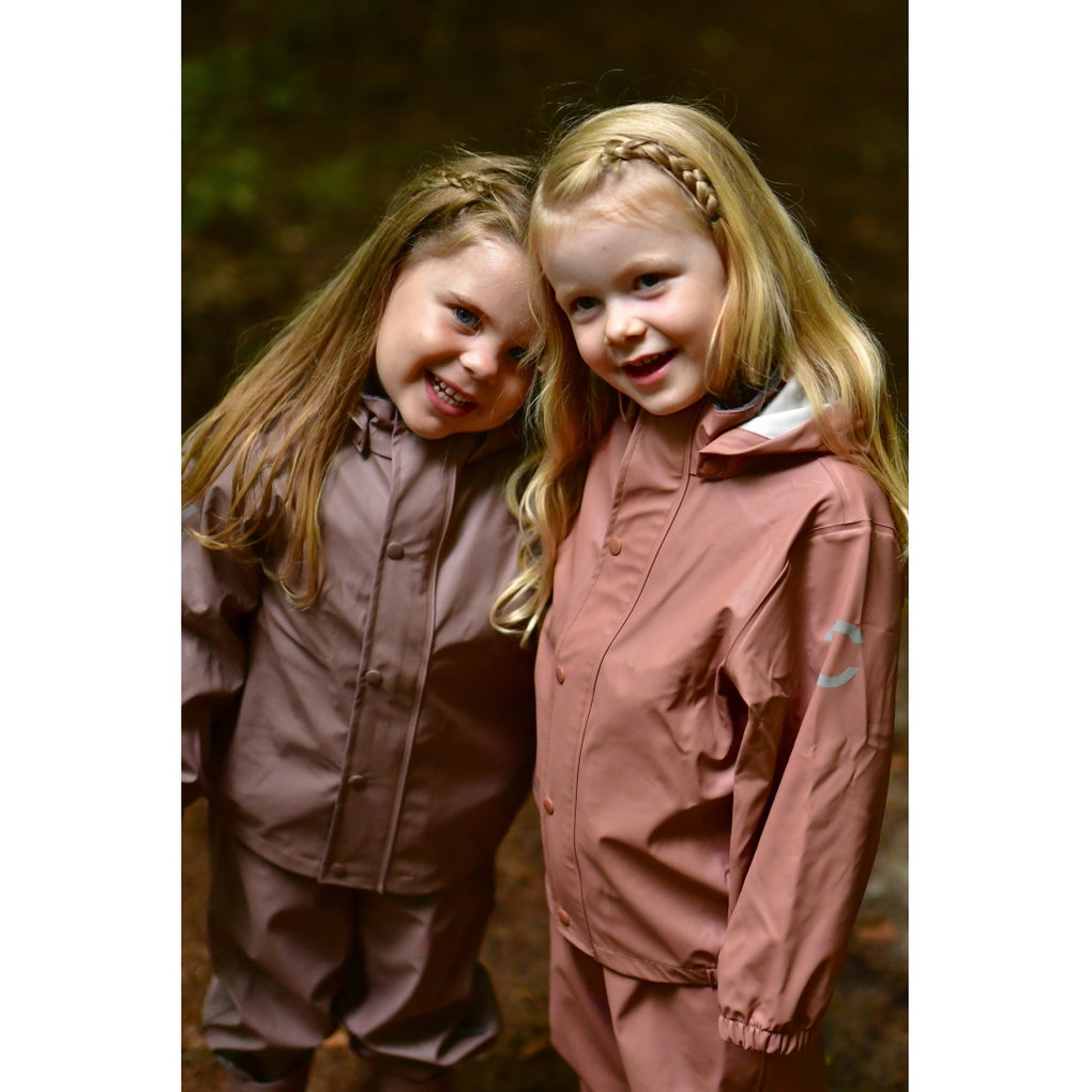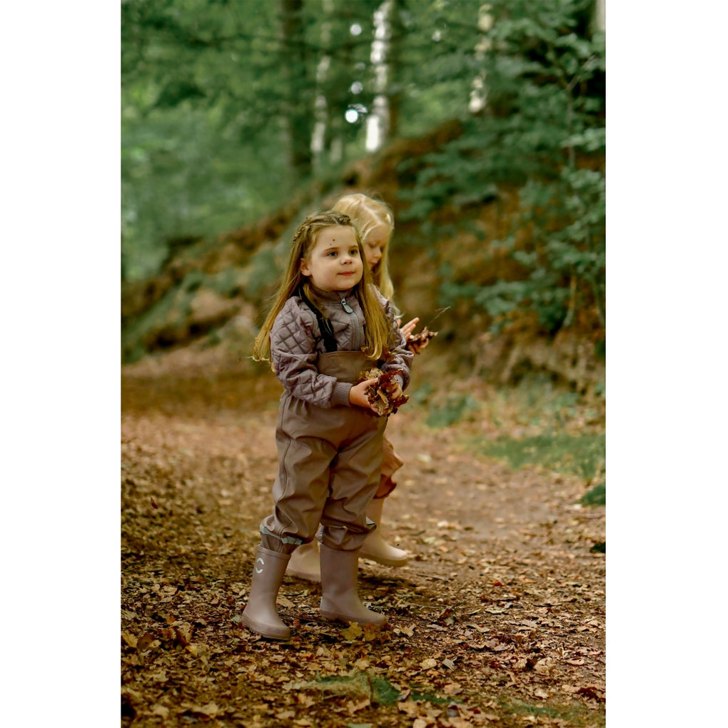 Mikk-line’s classic PU rainwear set with suspenders. This rainwear set is made of waterproof fabric from 66% GRS Recycled Polyester, 34% Polyurethane, and it is designed for children to have fun in the rain, jumping puddles, sliding down the wet slide, playing in the wet sandbox etc. Place the adjustable foot straps underneath the wellies/boots to prevent the pants from sliding up and keep the feet dry. The set also features a name tag with room for more than one name, so please pass it on and let it be re-loved.