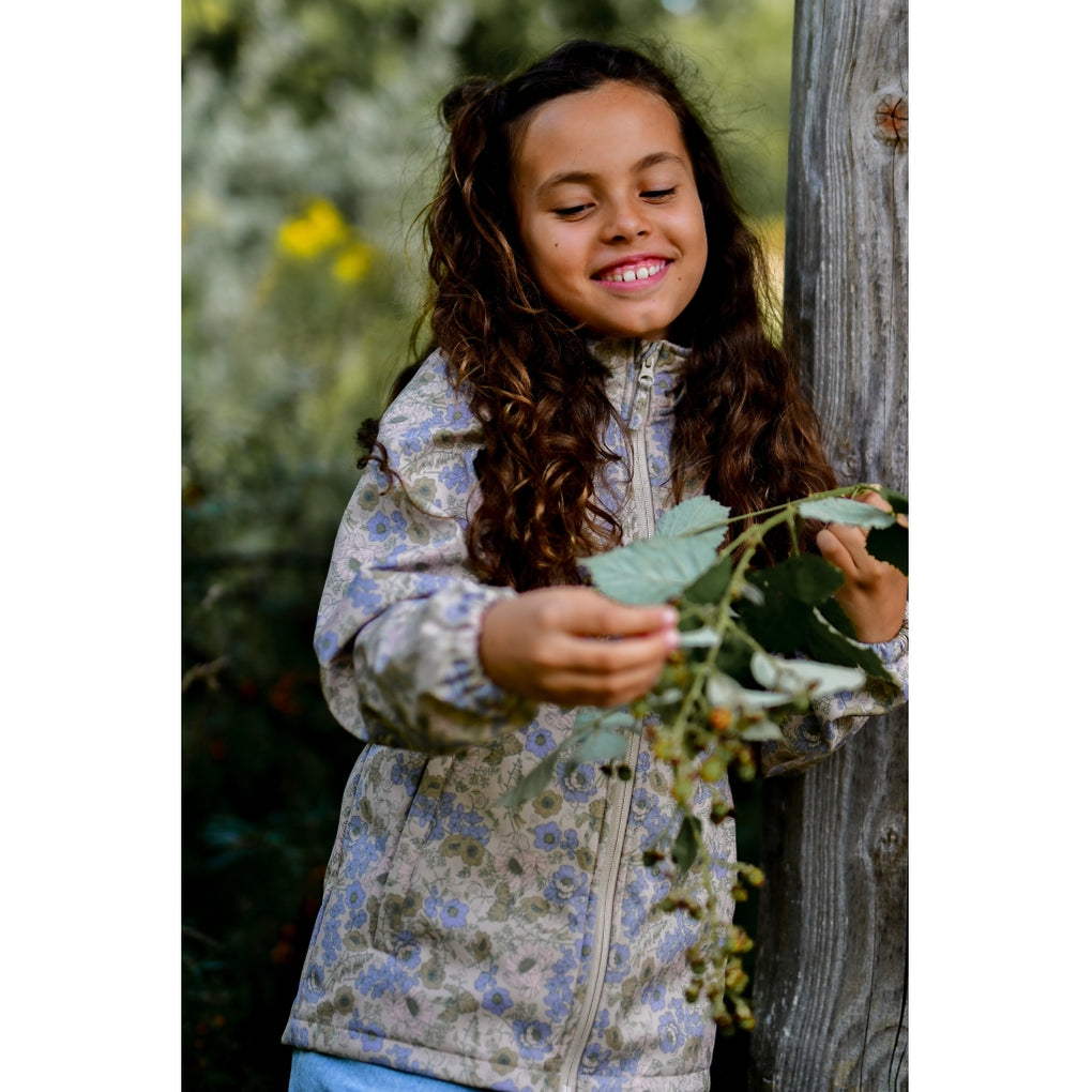 Mikk-line softshell jacket in a captivating nature AOP (all-over print), designed for girls to enjoy outdoor activities and adventures. This softshell jacket contains recycled polyester, and has flourine-free BIONIC-FINISH® ECO coating. The jacket features a name tag with room for more than one name, so please pass it on and let it be re-loved.