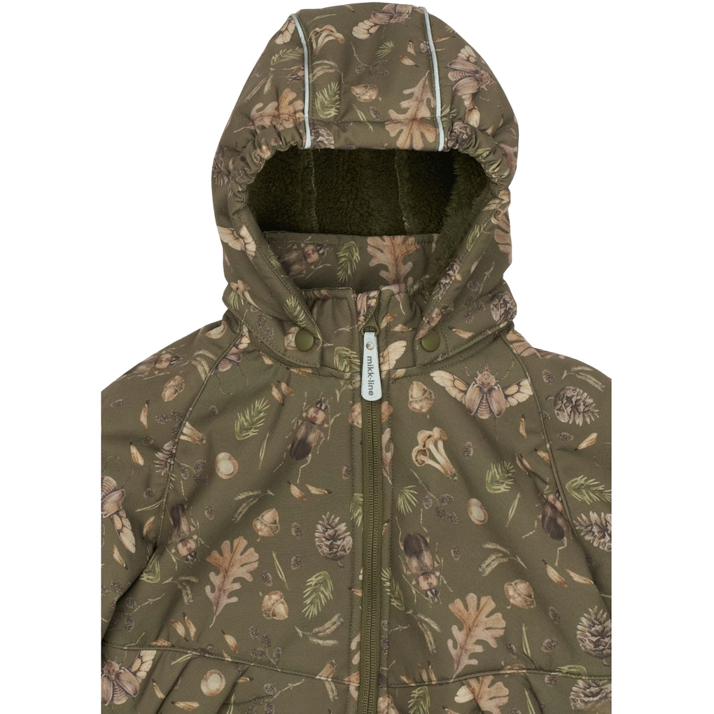 Mikk-line teddy softshell jacket with ears in a captivating nature AOP (all-over print), designed for children to enjoy outdoor activities and adventures. The outer fabric of this softshell suit contains 100% polyester. The jacket also features a name tag with room for more than one name, so please pass it on and let it be re-loved.