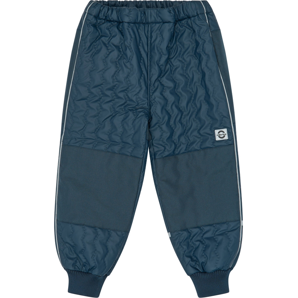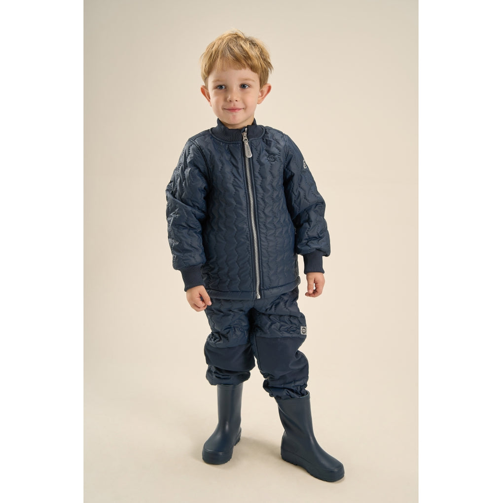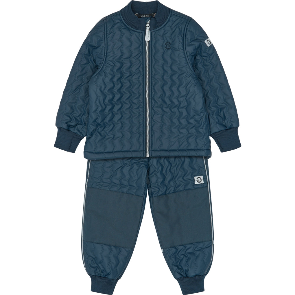 This soft DUVET set is the warmest thermal wear designed by mikk-line, as the jacket has warm fleece lining. The main fabric on both the jacket and pants is waterproof, extra wear-resistent, and coated with BIONIC-FINISH® ECO it is certified with OEKO-TEX® Standard 100 aswell (without PFAS/fluorides). However, the seams are not waterproof, and the breathability is relatively low. As it is extra insulating and waterproof, it is a great outerwear outfit for children to stay warm and enjoy outdoor adventures in cold, windy and wet weather. The set also features a name tag with room for more than one name, so please pass it on and let it be re-loved.