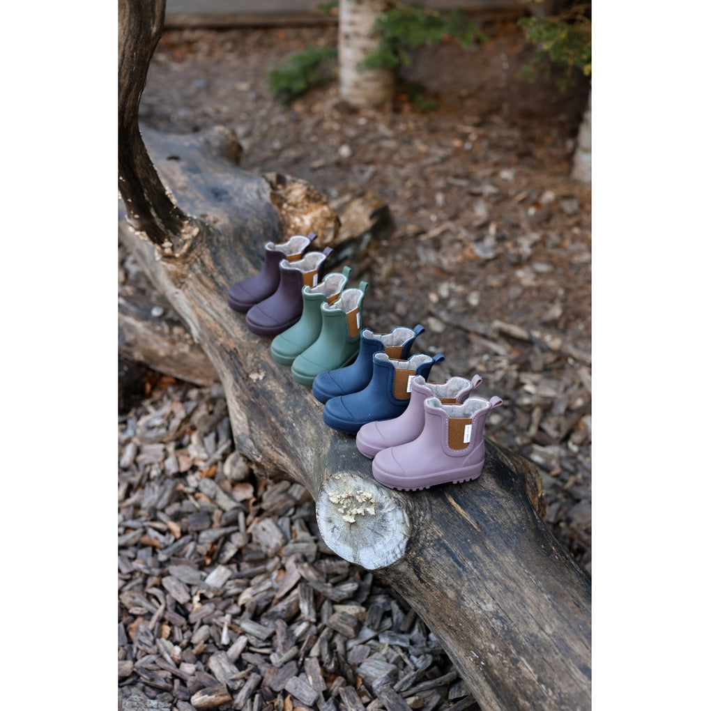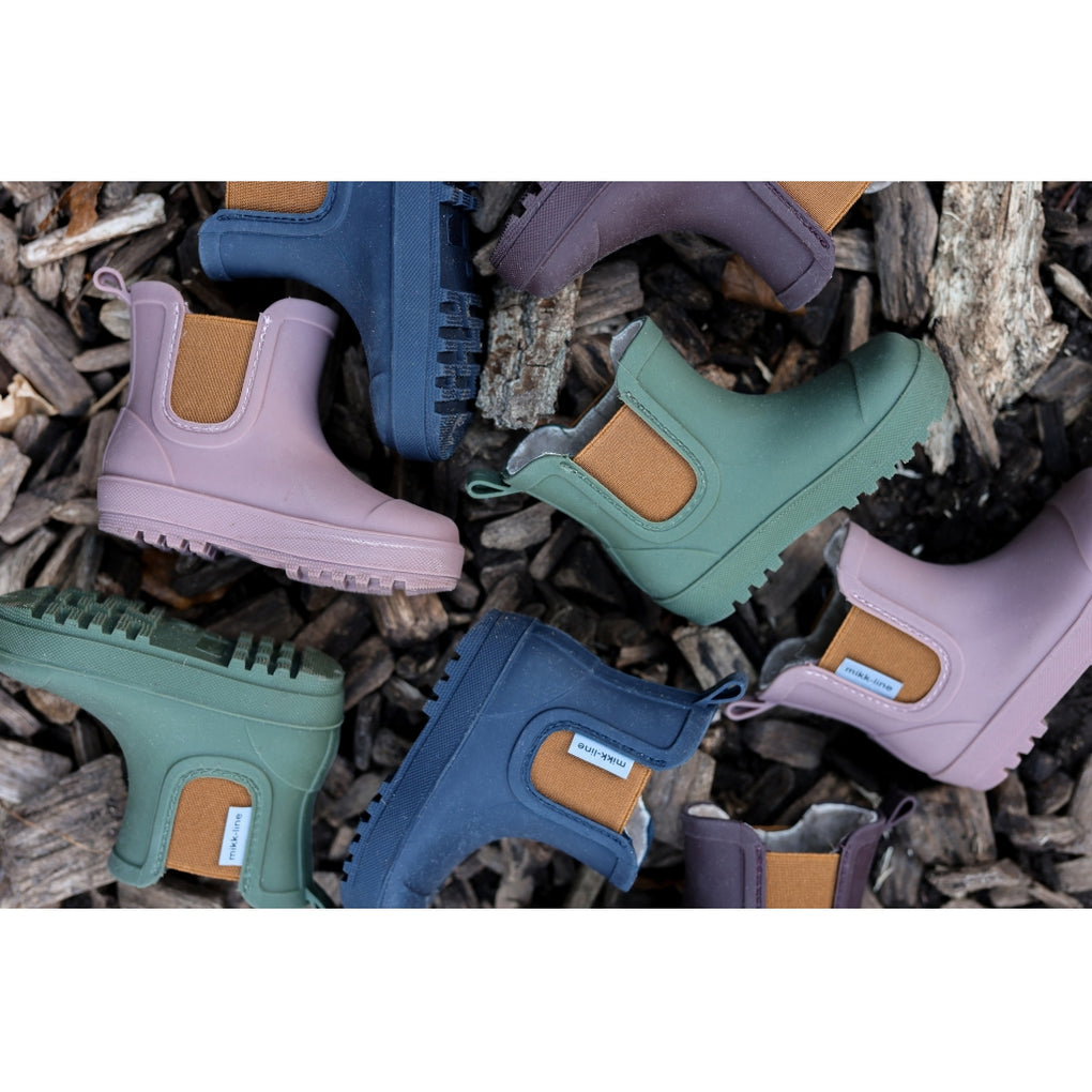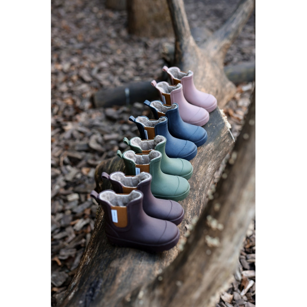 Mikk-line short winter rubber boots are made with flexible barefoot soles, natural rubber, and are free from phthalates. The rubber boots are available in sizes 21-35 and are specially designed for little ones, making it easier for them to walk, sit, and play without long boot shafts. These solid-colored ankle rubber boots are waterproof and practical for children who love jumping in puddles or walking on wet grass.