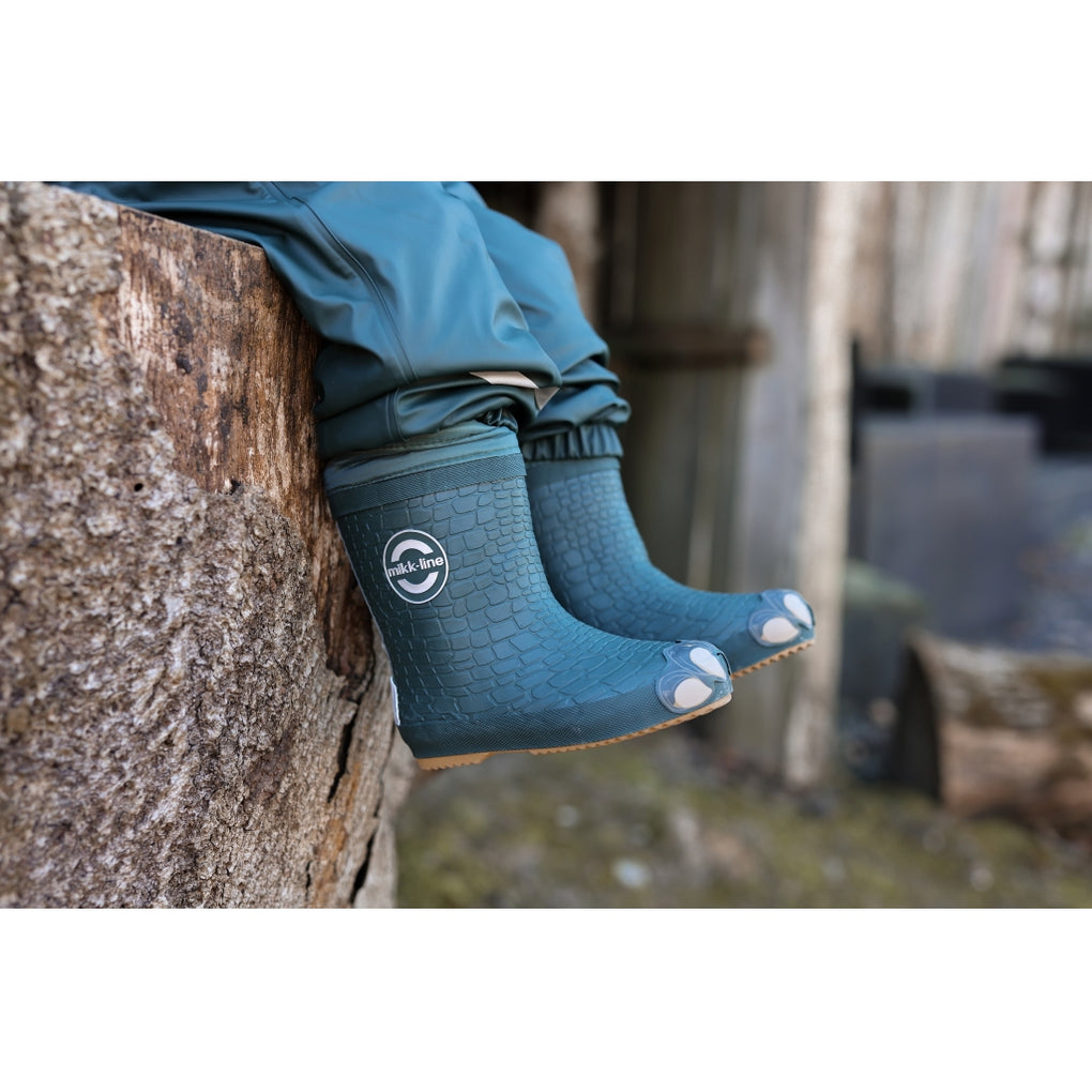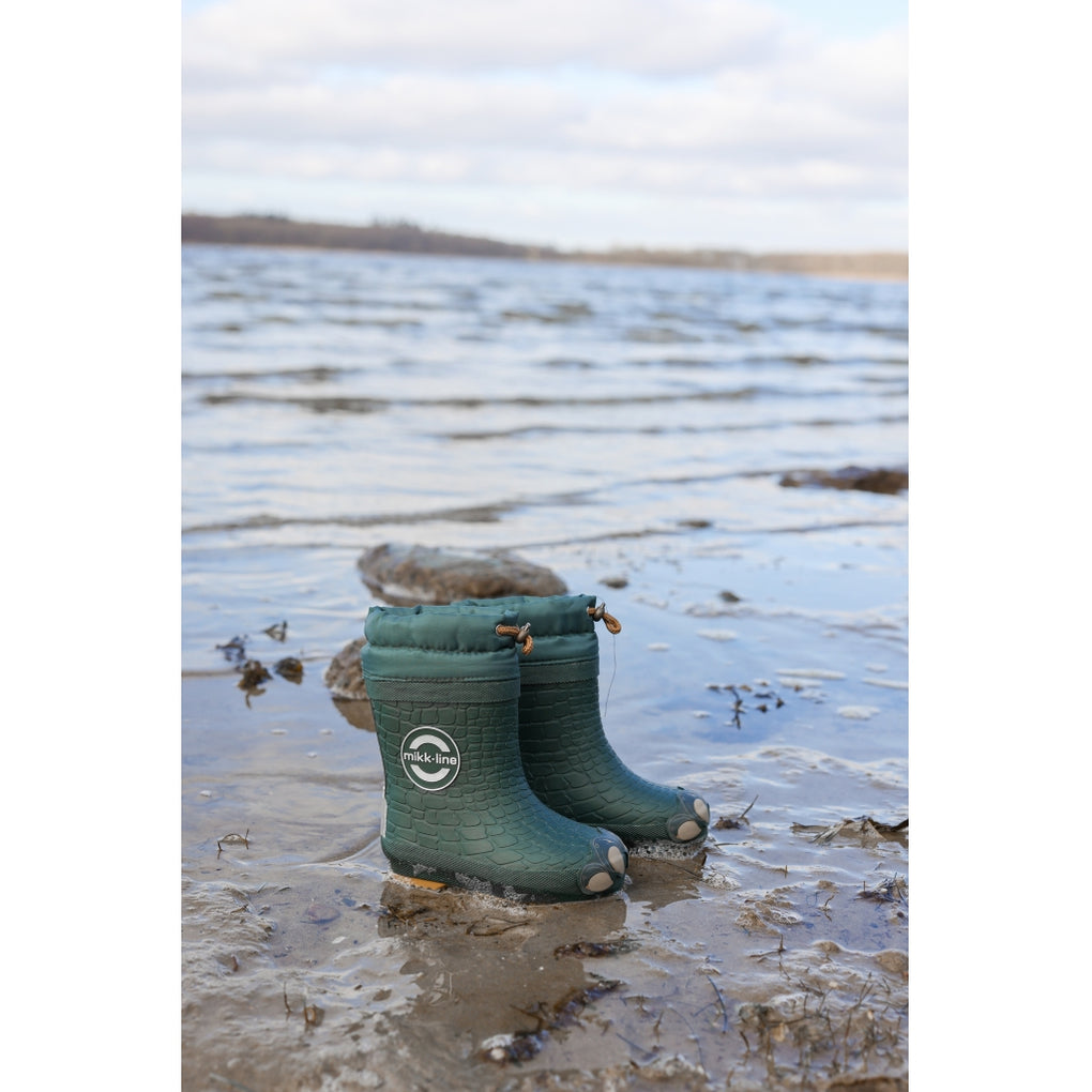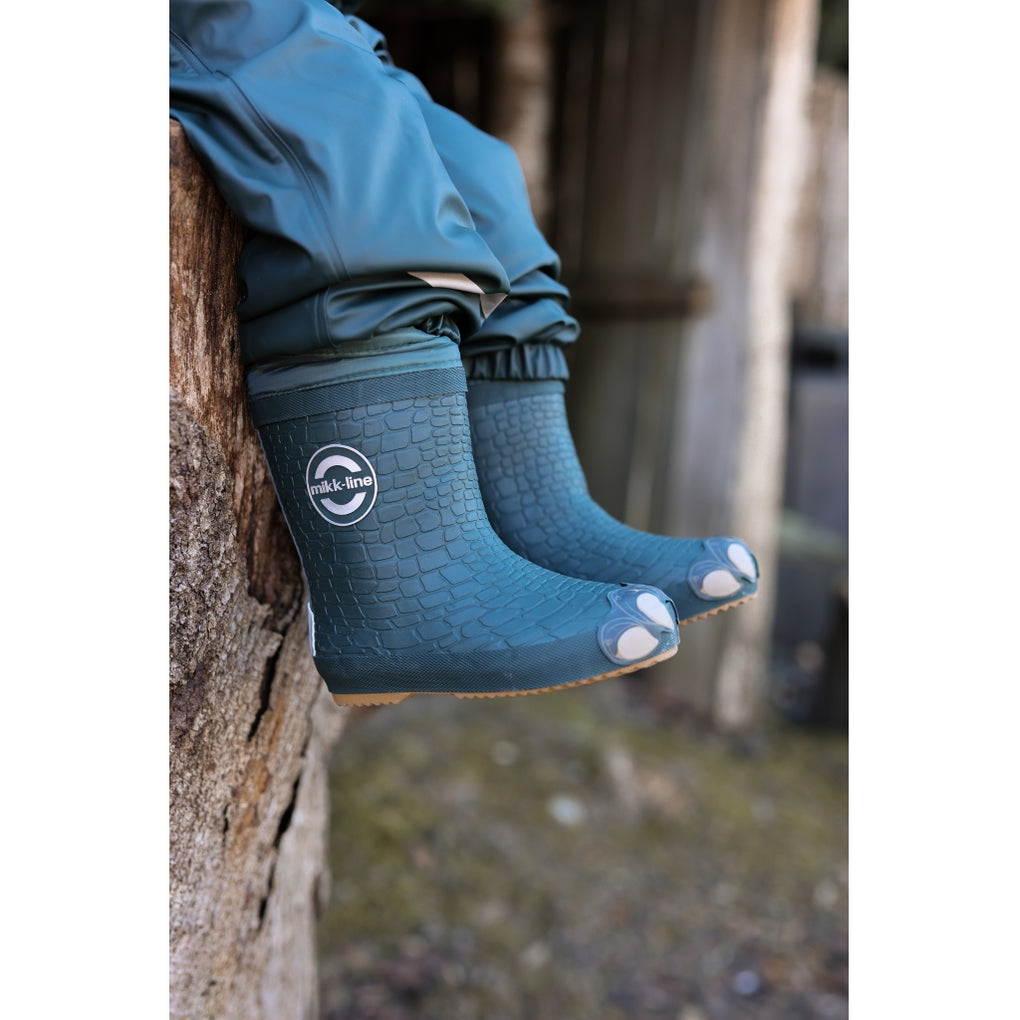 These solid colored mikk-line winter wellies with a 3D dino patch, made with warm lining and with natural rubber and phthalates free. The wellies are naturally waterproof, warm, and practical for children who love to jump in water puddles or play in the wet grass, sand, or snow. The wellies are available in size 19-38 across various colors for both boys and girls.