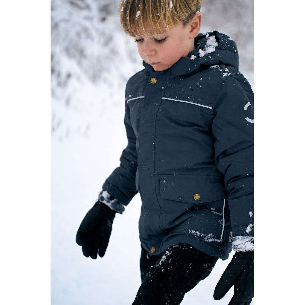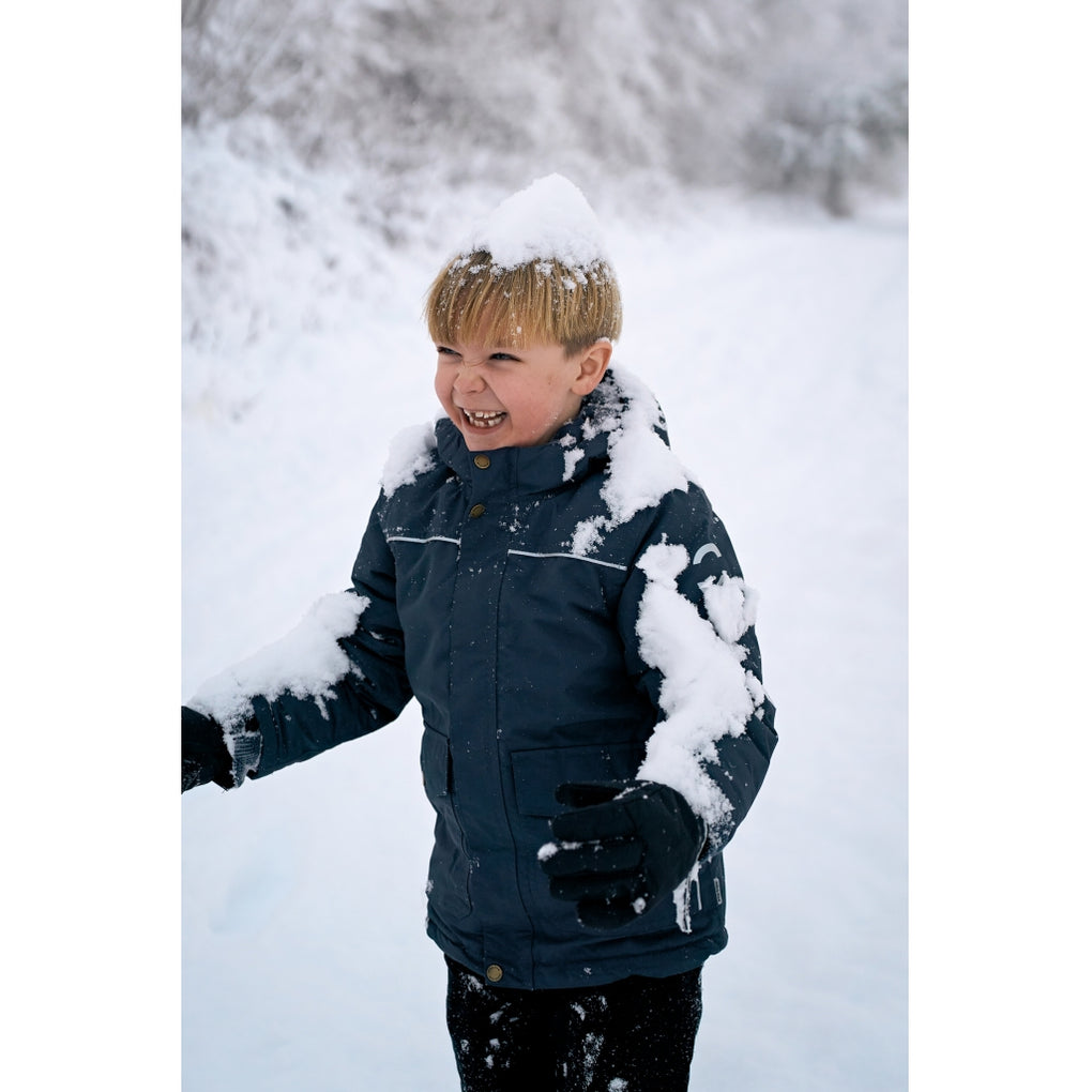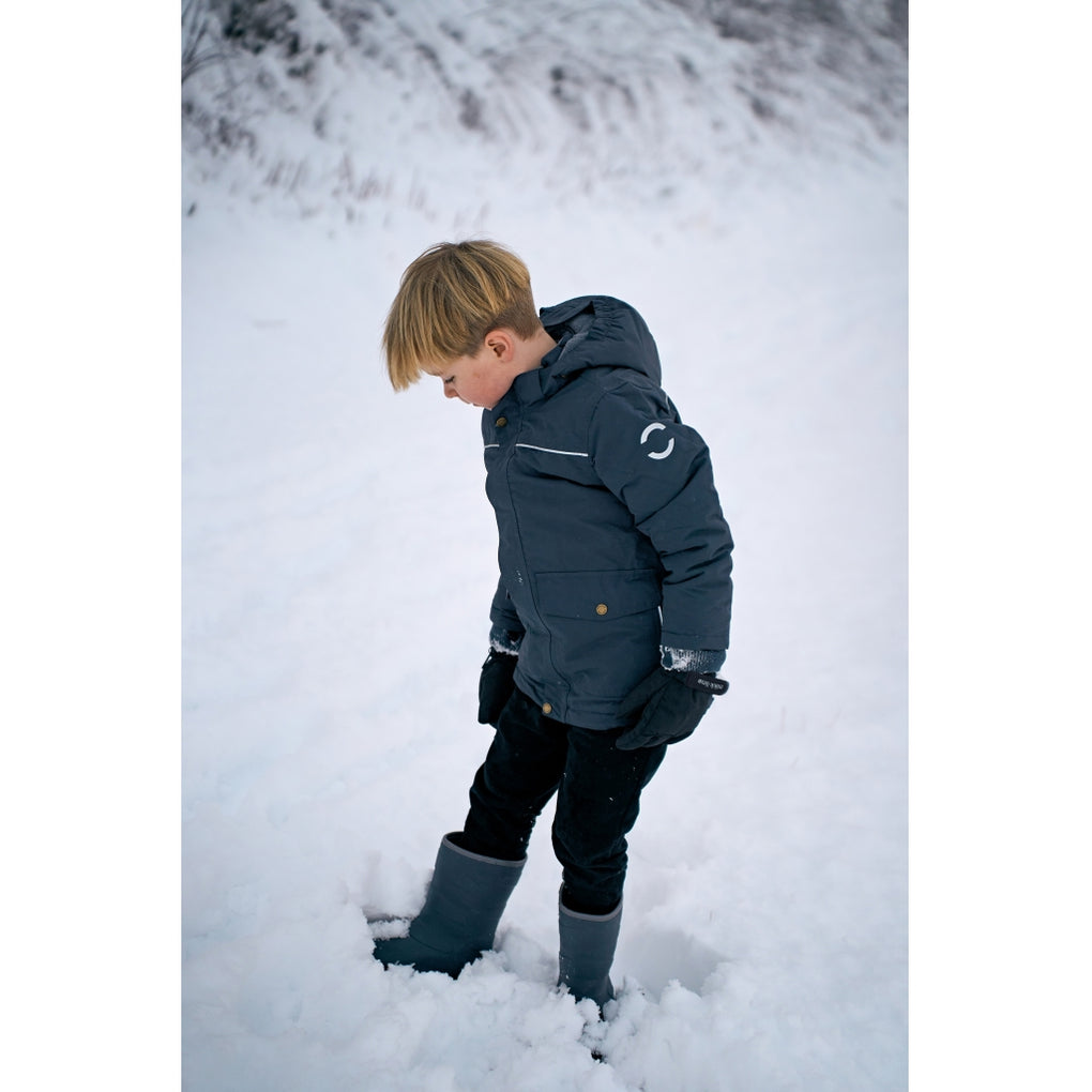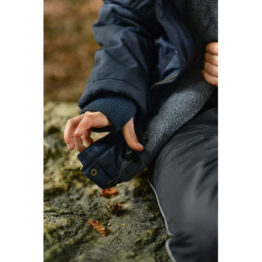 Mikk-line winter jacket for boys in sizes to enjoy outdoor activities and adventures. This quality jacket is made from nylon and has fluorine-free coating (BIONIC-FINISH® ECO). The jacket contains polyester padding, and the hood and body have soft fleece lining. The sleeves and pockets have sleek, frictionless taffeta lining. The tafetta lining is dyed with Solution Dye to reduce our consumption of water, chemicals, and energy. It is an excellent outerwear item that will keep your child warm, dry, and comfortable in wet, windy, cold, and snowy weather.