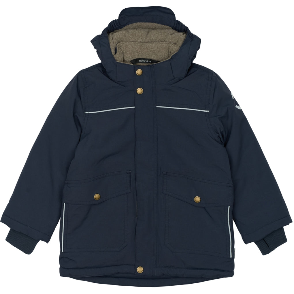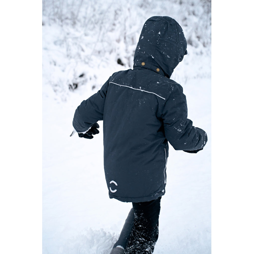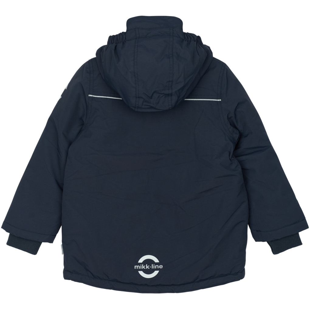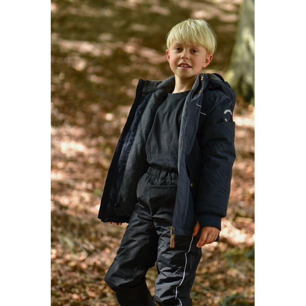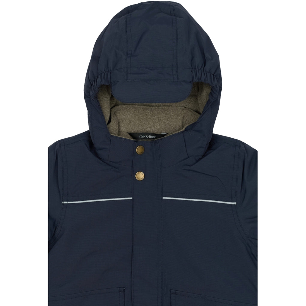 Mikk-line winter jacket for boys in sizes to enjoy outdoor activities and adventures. This quality jacket is made from nylon and has fluorine-free coating (BIONIC-FINISH® ECO). The jacket contains polyester padding, and the hood and body have soft fleece lining. The sleeves and pockets have sleek, frictionless taffeta lining. The tafetta lining is dyed with Solution Dye to reduce our consumption of water, chemicals, and energy. It is an excellent outerwear item that will keep your child warm, dry, and comfortable in wet, windy, cold, and snowy weather.