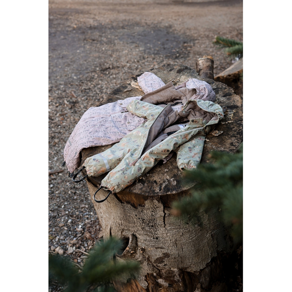 The fabric of this practical snowsuit is made from recycled PU, which keeps the child warm and dry. The suit is easy to get on/off, and the child will be fully covered and have free movement without any water or wind getting inside the suit. The snowsuit has a fluorine-free water- and dirt repellent, so when the outdoor fun is over and the suit is covered in mud, you can enjoy a super easy cleaning with just a wet cloth!