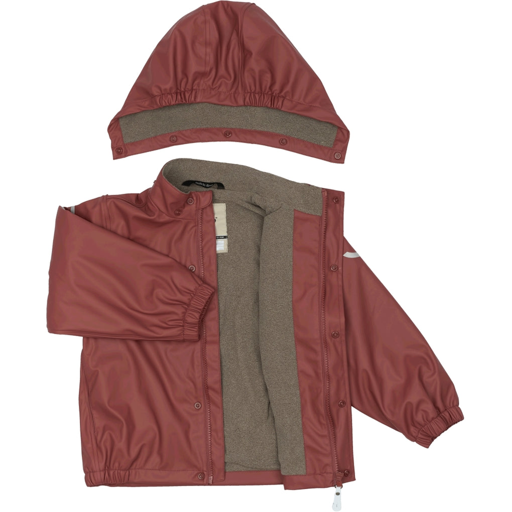 Extra warm PU rainwear set from mikk-line, for children to have fun in the rain, jumping puddles, sliding down the wet slide, playing in the wet sandbox etc. This rainwear set is made with recycled polyester, which is waterproof. The body, hood, collar, and upper parts of the sleeves and pants have soft fleece lining, while the lower parts of the sleeves and legs have sleek, frictionless taffeta lining.