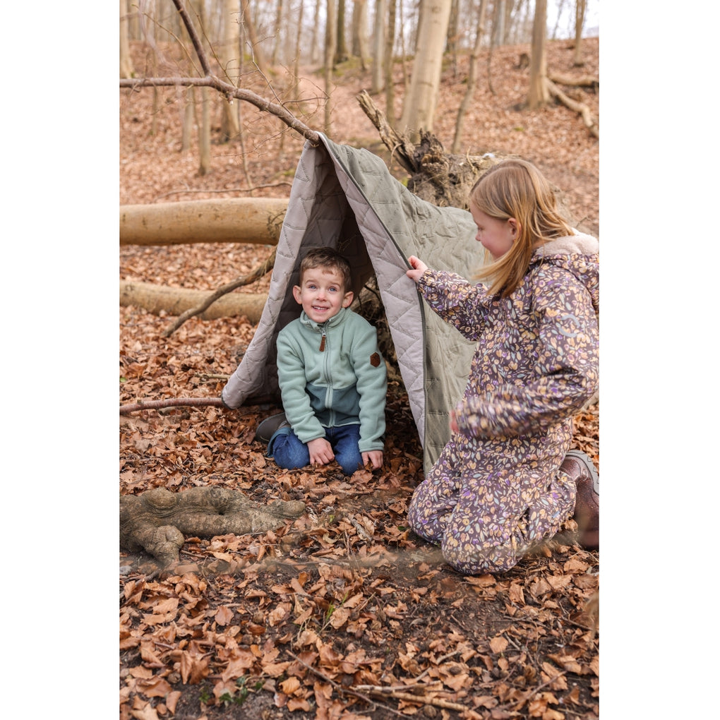 Cosy warm and printed PU rainwear suit from mikk-line, for children at age 9 months to 12 years old (74-152 cm.) to have fun in the rain, jumping puddles, sliding down the wet slide, playing in the wet sandbox etc. In this warm rain suit the child will be fully covered and have free movement without any water or wind getting inside the suit.